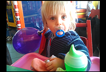 Alors fort heureusement nous avons pu être un moment seul et il a pu en profiter mais très vite il a commencé à se faire bousculer voir écraser alors on l'a sorti, il s'est amusé avec les ballons et puis nous avons dû nous résoudre à partir. En même temps c'est pas le type d'endroit où on a envie de rester des heures à papoter non plus, nous avons même trouvé nos hamburgers pas terribles... moi qui me fais toujours une joie de manger ces trucs là je suis toujours déçue je devrais commencer à le savoir quand même !