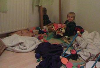 On avait passé une bonne grosse journée à jouer avec Petit Loulou, on avait envie de passer du temps un peu tous les deux en amoureux en fin d'après-midi chéri-chéri et moi, on était crevé surtout et on voulait s'affaler sur le canapé comme deux viocs épuisés que nous sommes en fait. Il n'a pas ronchonné quand on l'a laissé dans sa chambre. La veille il avait fait tomber sa table à langer alors cette fois papa avait fermé et mis le meuble contre le mur pour plus de sécurité. On l'entendait jouer à l'étage on se doutait bien qu'il y aurait quelques "traces" de son passage et de ces minutes de quiétude : des couches parsemées de ci de là, ou des jouets dans tous les sens mais là il a battu le record je crois ... Un vrai carnage!