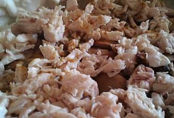 - Faire cuire le poulet le saler et le couper en petits morceaux.