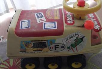 Un camion tout pourri (avoue, c’est ce que tu t’es dis?), le blanc est passé, il y a plein d’autocollants moches et illogiques comme Camel (oui, oui, les cigarettes), 3615 machinchose (oui, oui, l’époque du minitél)… Mais voilà, c’était mon camion à moi! Un camion Fisher price à 6 roues, super stable et qui peut supporter 90 kilos! On en fait plus des jouets comme cela!?? Mais pourquoi ont-il arrêté la production en 1982?