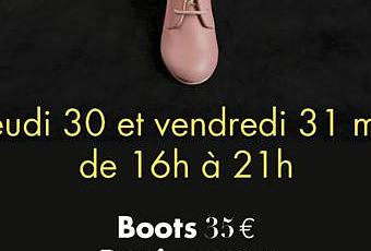 Demain et vendredi c’est la braderie pour les chaussures Clotaire ! Les bottes et bottines sont à 35€, les Derbys sont à 45€ et les accessoires à -10€.