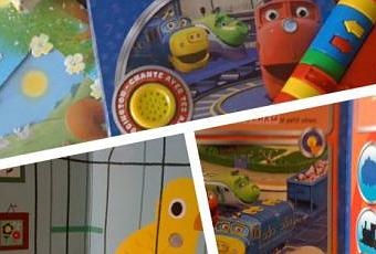 A partir de son premier anniversaire, ma fille a beaucoup apprécié le livre Vtech avec deux comptines par page et le livre Chante et découvre les formes avec Chuggington. Avec les comptines apprises à la crèche, celles qu’on se chante à la maison, ma fille a adoré en retrouver dans le livre Vtech "Ainsi font, font, font", "Savez-vous planter les choux"… J’avoue que ce genre de livre est d’un côté très sympa car on peut ajouter une gestuelle aux comptines mais d’un autre côté, l’angoisse d’entendre x fois (le x cachant le mot TROP) les mêmes chansons plutôt courtes en plus… Côté Chuggington, ce n’est gère mieux: il y a le même bouton pour le générique accessible depuis toutes les pages… Heureusement, la pile s’use vite et elle n’a pas encore été remplacée (mauvais parents) mais le livre intéresse malgré cela suffisamment ma fille qui continue à demander comment s’appellent les petits trains, quelles sont leurs couleurs… C’est cela l’inconvénient des livres sonores: la répétition peut vite lasser les parents!