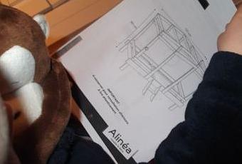 Premier truc à faire: tout déballer. Le couloir est rempli de planches. Ma fille, le singe accroché au cou, lit la notice "pour papa et maman et Sélène". Elle aussi est dans l’effervescence! Une très bonne surprise pour moi: tout est numéroté, chaque planche, chaque ensemble de vis… Impossible ou presque de se tromper. Je me mets dans mon rôle de chef de chantier, secondé par la miss, très impatiente! Elle restait collée alors que pour une fois, elle avait son dessin animé dans le salon tranquille mis sur la TV…