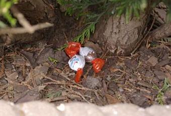 Super-mamie-par-trois-fois avait réalisé sa mission en moins de temps qu’il faut pour l’écrire. C’est ça d’avoir une fille excitée pressée de chasser les oeufs. Normal, ce n’est qu’une fois par an! C’est trop triste d’ailleurs (allez surtout dire cela aux chocolatiers). La chose embêtante est qu’il faut compter le nombre d’oeufs que l’on cache pour être sûr que tout soit bien ramassé, et ça, quand on va vite, on peut oublier (rajoutez-vous de la difficulté en variant le format et la taille des oeufs!).